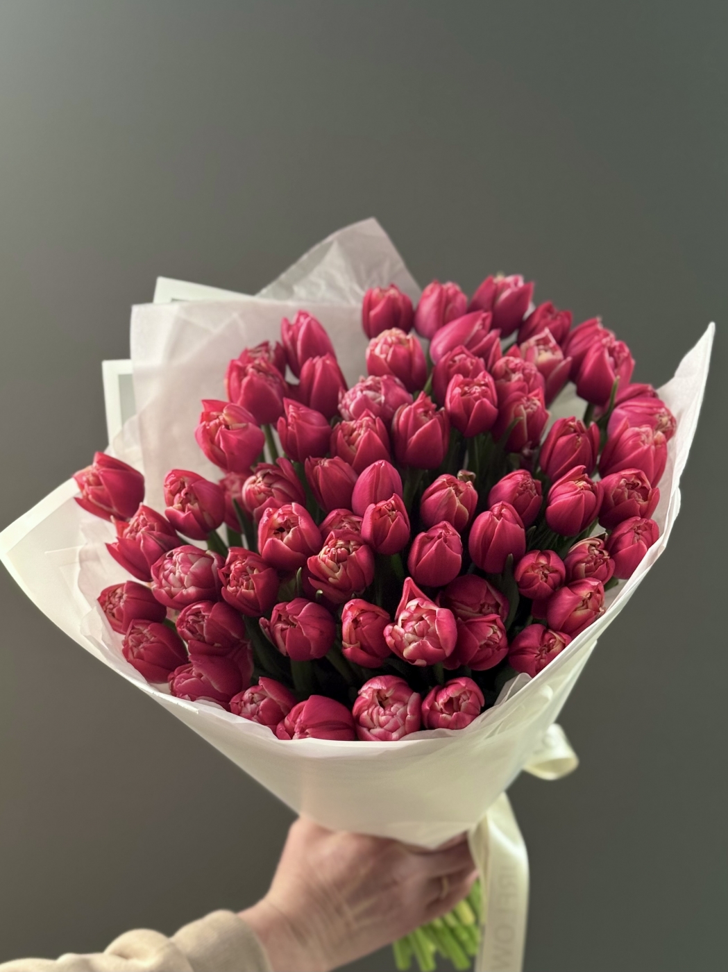Диаметр 30-35см высота 45см. Монобукет охапка тюльпанов 55шт в классическом оформлении.