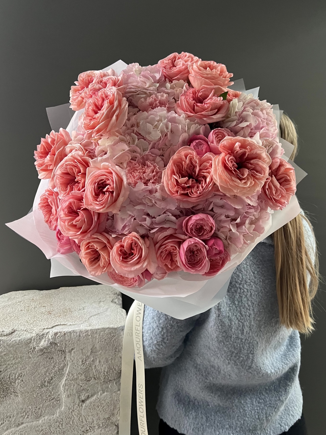 Диаметр 60см высота 55см. В составе пионовидные розы, кустовые пионовидные розы, диантусы, гортензии.