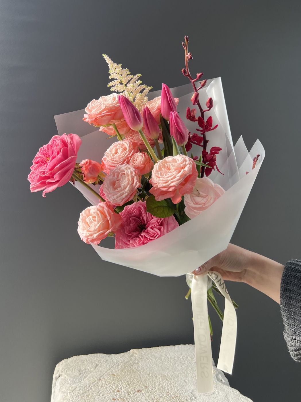 Букет диаметром 25см, высота 35см. В составе: кустовые розы, пионовидные розы, тюльпаны, орхидея, астильба.