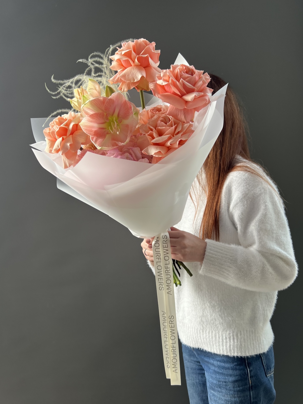 Букет диаметром до 35см, высота 45см. В составе: французские розы, амариллис, гортензия, стифа.
