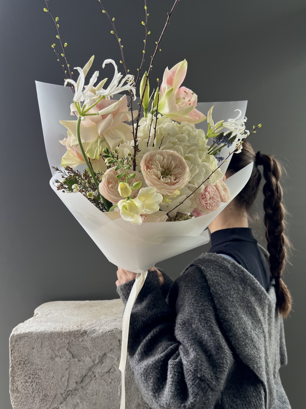 Букет диаметром 30-35см, высота 40см. В составе: амариллис, гортензия, нерине, фрезии, пионовидная роза, кустовая роза, француская роза, весенние веточки.