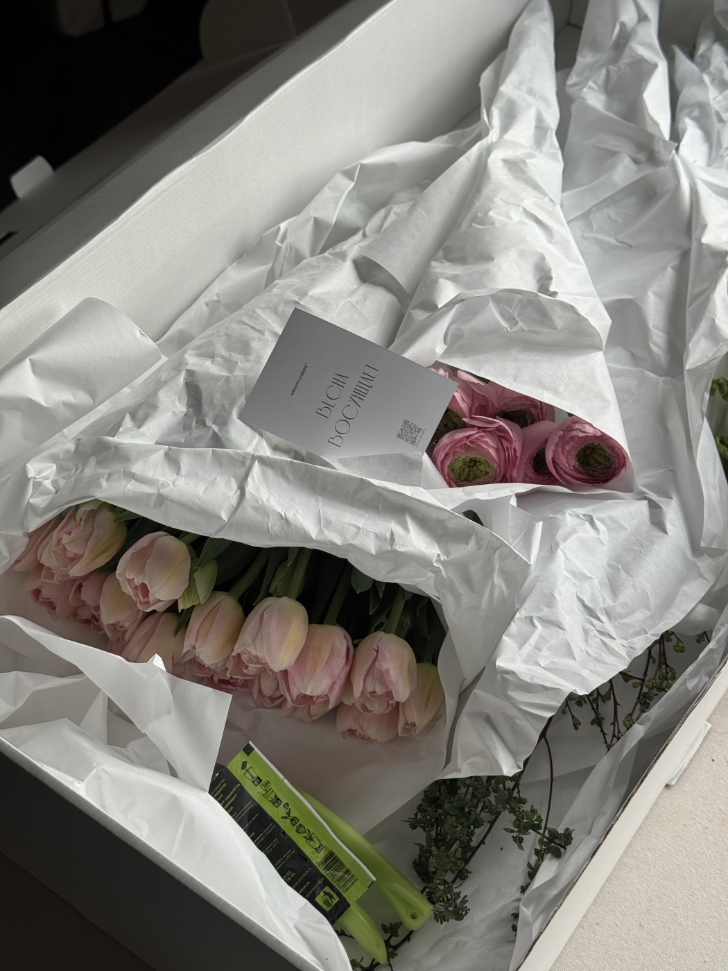 В наборе: тюльпаны 25шт, ранункулюсы 5шт, фрезии 5шт, весенние веточки, секатор, подкормка для цветов.