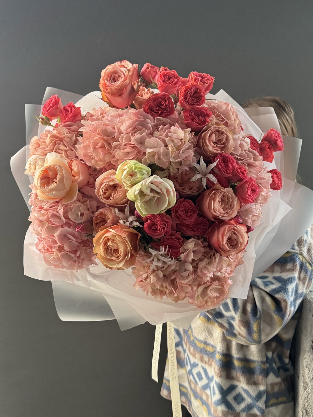 Диаметр 60см высота 55см. В составе гортензии, пионовидные розы, кустовые розы, амариллис, нерине.