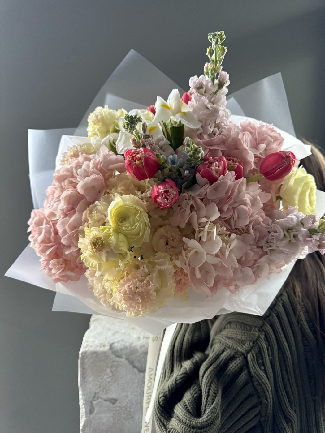 Диаметр 55см высота 50см. В составе: Гортензии, тюльпаны, ранункулюсы, ирисы, маттиола, оксипеталум.