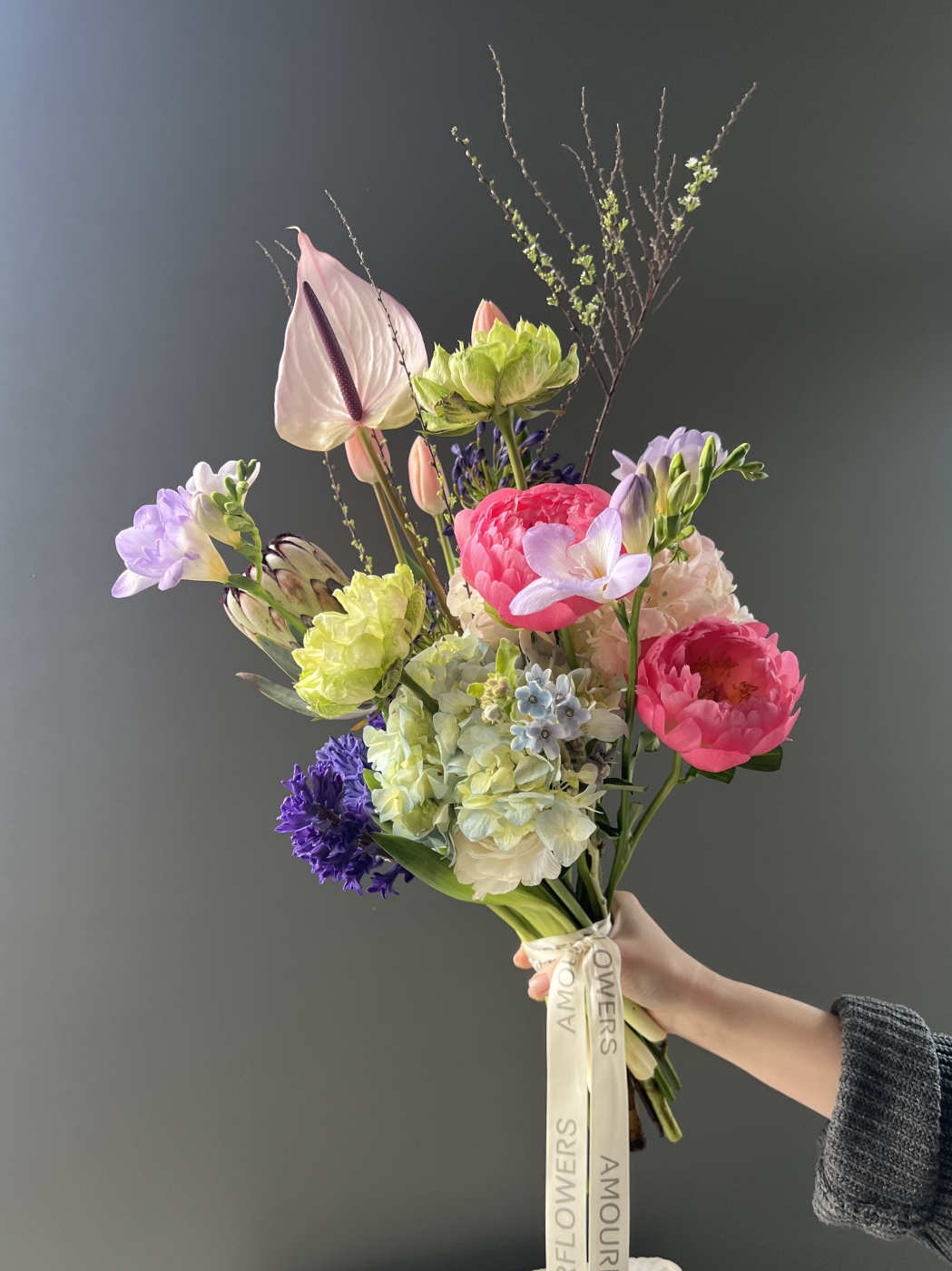 Букет диаметром до 35см, высота до 50см. В составе: пионы, гортензии, антуриум, протея, розы Вегги, фрезии, гиацинты, тюльпаны, оксипеталлум, весенние веточки.