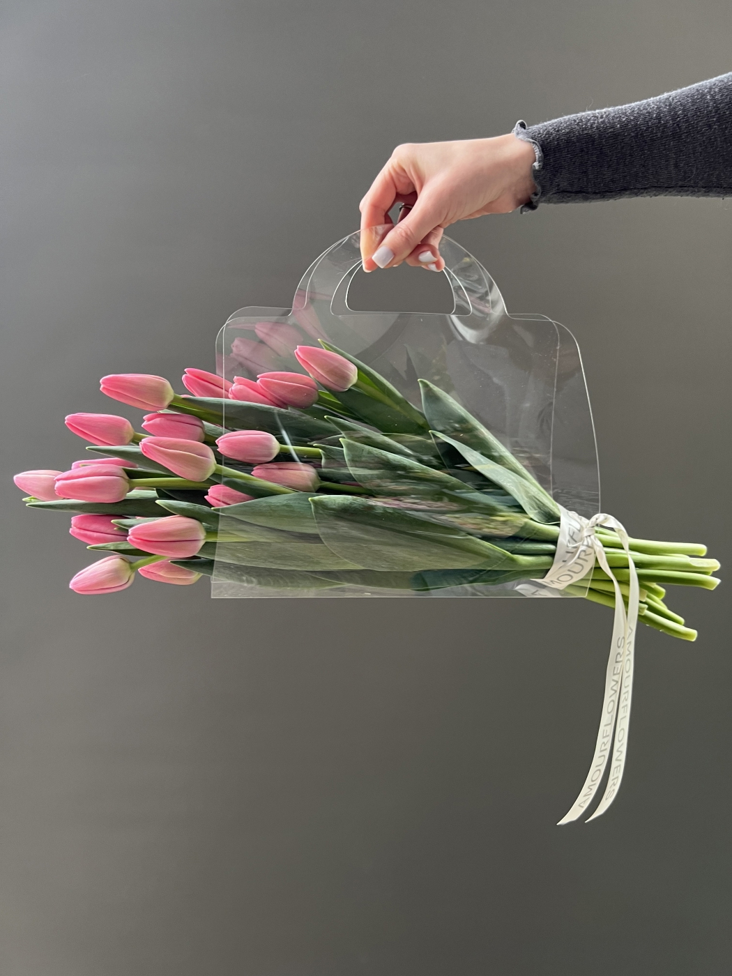 Охапка тюльпанов сорта Трезор в акриловой прозрачной сумочке.