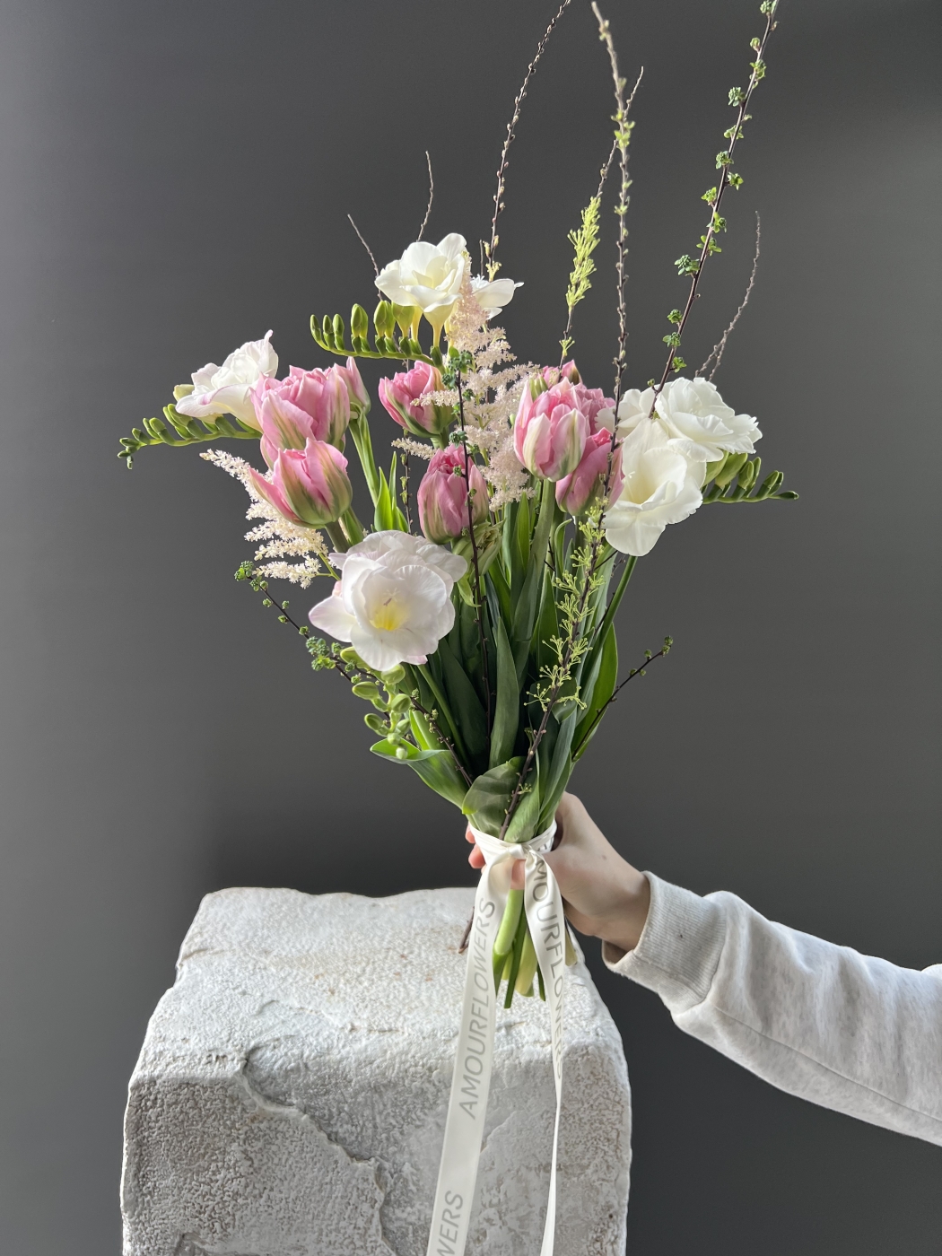Букет весенних цветов в нежной розовой гамме. Диаметр букета 25см высота 40см. В составе: тюльпаны, фрезии, гиацинт, весенние веточки.