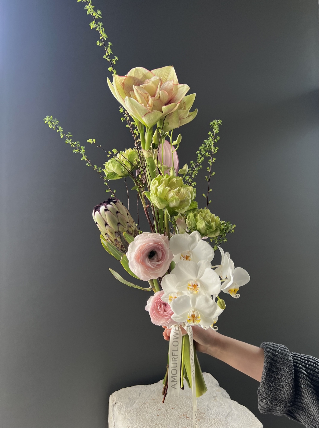 Букет диаметром до 25см, высота 55см. В составе: амариллис, антуртум, орхидея, розы Вегги, протея, ранункулюсы, весенние веточки.